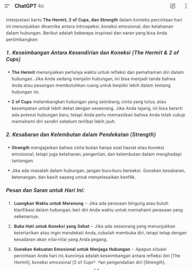 Coba saja, misalnya, mau bertanya seputar jodoh, “Apakah saran/ inspirasi untuk percintaan saya hari ini apabila kartu yang keluar adalah The Hermit, 2 of Cups, dan Strength ?” Saya mencoba memasukkannya ke ChatGPT dan ini hasil screenshotnya.