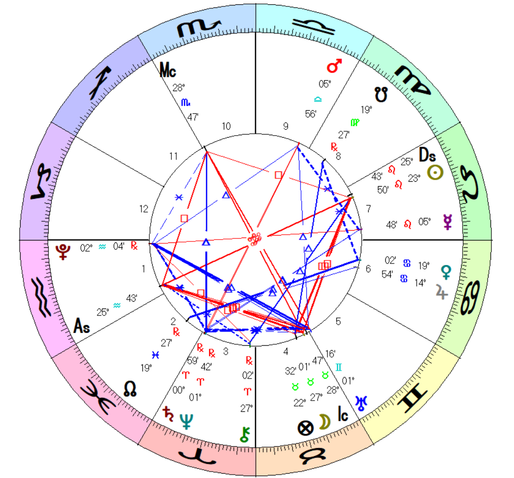 Pluto di House 1 Aquarius, dengan ruler (Saturn) di Aries house 3, bersama neptune dan chiron. Saturn, Neptune, dan Chiron retrograde.