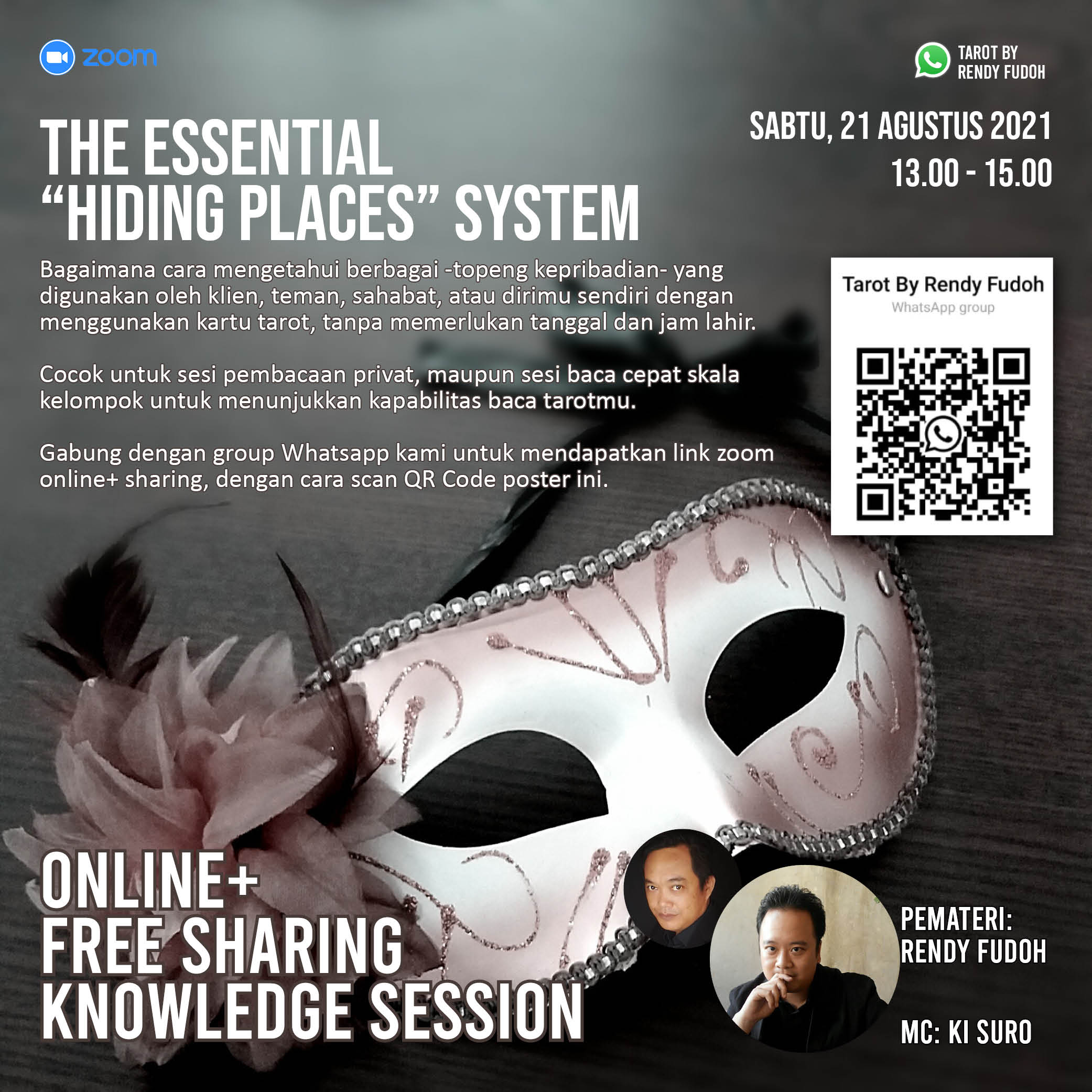 Topik kali ini adalah perkenalan sistem “Hiding Places”, sebuah sistem yang sudah digunakan oleh sebagian tarot reader profesional, dimana dengan sistem tersebut, kita bisa membaca klien tanpa perlu data pribadinya, plus bisa sekaligus menghibur penonton yang ada di waktu bersamaan.