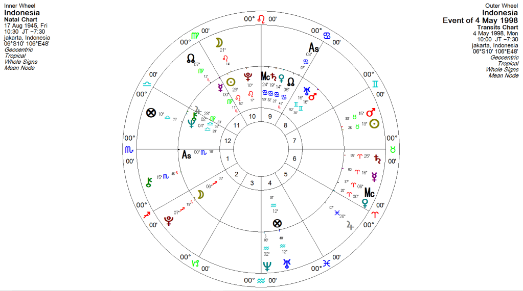 Kalau kita perhatikan, pada tanggal 4 Mei 1998 itu, Transit Jupiter di 20 derajat Pisces itu Square Dengan Natal Mars Uranus Conjunct di 16 derajat Gemini. Bagi yang mengerti astrologi, saya mencoba menggunakan orb Jupiter sekitar 9 derajat penyimpangan untuk suatu fenomena masuk kedalam kategori aspect (Berdasarkan buku Christian Astrology oleh William Lily). Secara riilnya, Square Aspect terjadi ketika jarak 1 planet dengan planet lain di chart astrologi, berjarak 90 derajat. Karena jarak transit Jupiter dengan natal Mars – Uranus adalah 86 derajat, tapi masih dalam toleransi 9 derajat tersebut, maka saya masih menganggap planet tersebut mengalami square aspect.