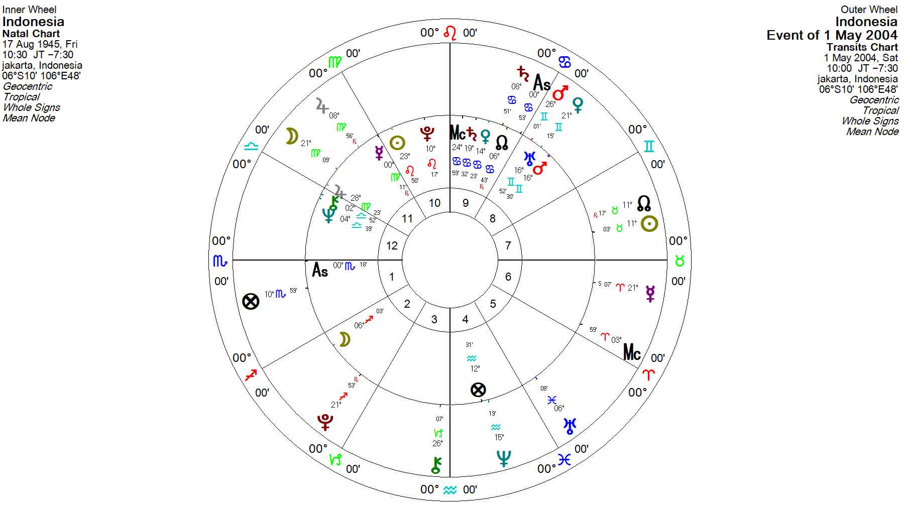 Menurut situs detik.com , pembacaan teks proklamasi, disepakati untuk dibacakan pada tanggal 17 Agustus 1945 jam 10:30 WIB. Data ini saya jadikan sebagai acuan untuk membuat chart kelahiran negara Indonesia. Berikut chart lahir astrologi Indonesia.