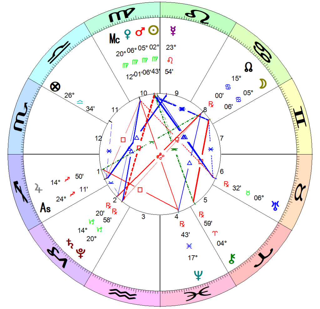 Virgo sendiri adalah zodiak yang berfokus kepada pelayanan publik (ketimbang diri sendiri), dan pelayanan tersebut juga termasuk mempertimbangkan hal – hal yang mendetail. Di virgo sendiri, selain ada MC (titik puncak reputasi), juga ada planet Venus, Mars, dan Matahari di chart tersebut. Selain itu, Venus terlihat 1 garis alias Conjunct.
