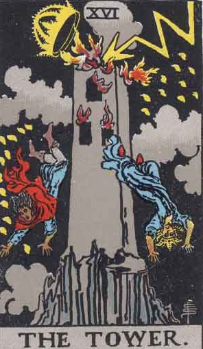 Contoh lainnya yang bisa kita gunakan adalah kartu tarot The Tower. Seperti biasa, kartu tarot the tower seringkali melambangkan sesuatu yang datang secara tiba – tiba hingga merusak fondasi yang sudah kita bangun dengan susah payah. Makna tersebut sering muncul di benak kita karena ilustrasi yang seringkali ditampilkan adalah ilustrasi bangunan yang rusak tersambar petir, dan petirnya sendiri menusuk tajam sampai ke fondasi bangunannya tersebut.
